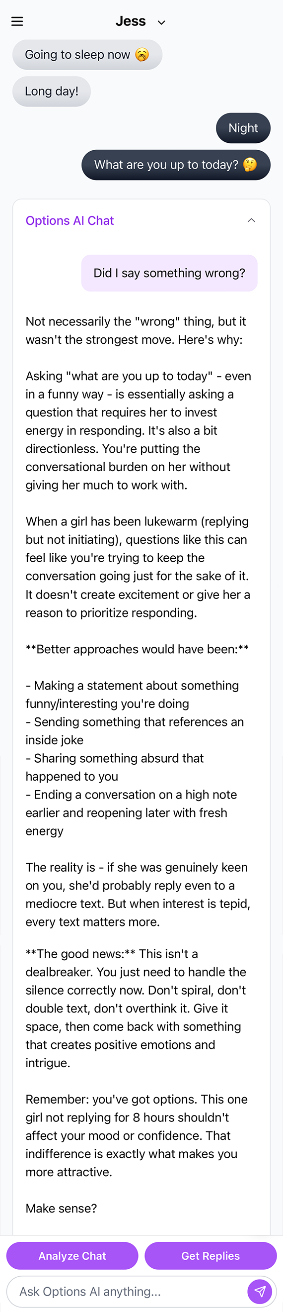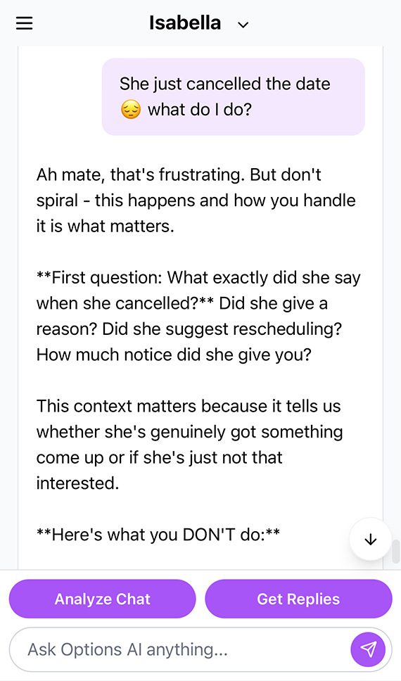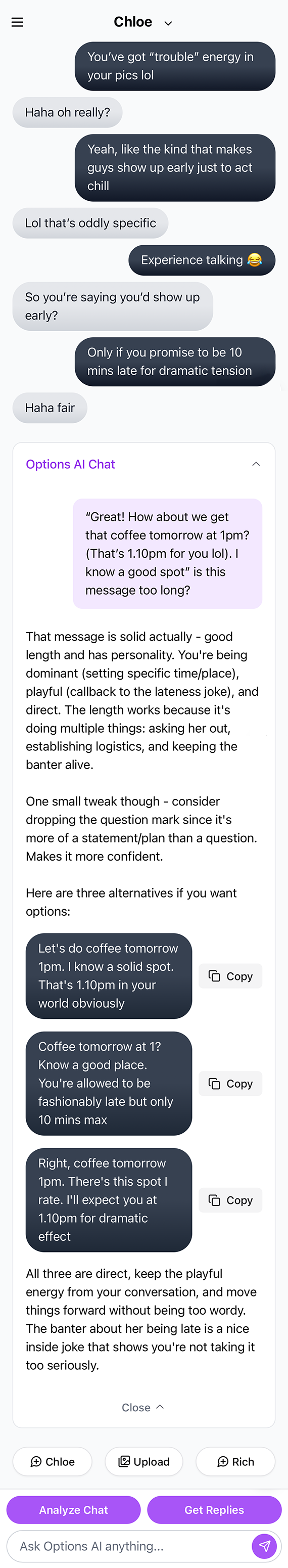 Options AI is an AI-powered dating assistant that helps analyze your conversations and provides smart reply suggestions to improve your dating communication.