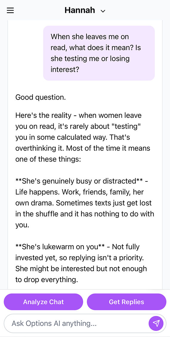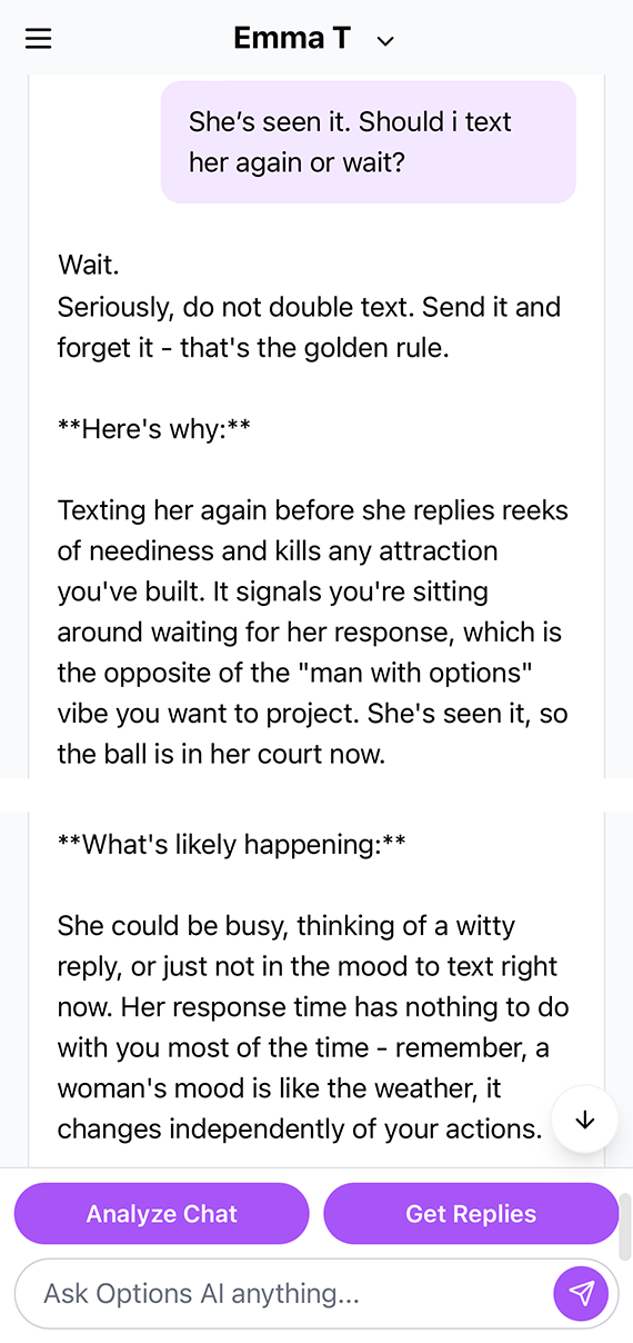 No matter where she’s from, Options AI will match her tone. It picks up on the subtle nuances in texting style and personality and will determine what texts will work best based on your previous chat history with her.